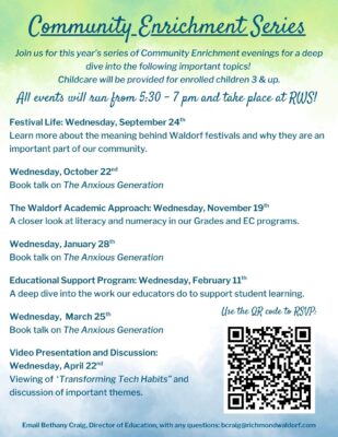 Richmond Waldorf School is continuing to offer Community Enrichment events that are open to our current families as well as the broader community. All events are taking place on campus Wednesday evenings from 5:30 to 7 pm. Childcare available for currently enrolled students. Click on the link below to RSVP!